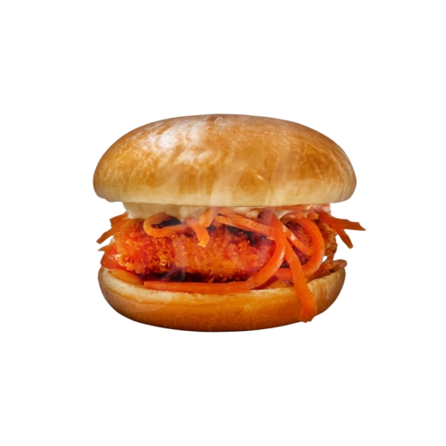 Булочка бриошь, нежное куриное филе в панировке, морковь по-корейски, фирменный соус, томат, спайси соус.