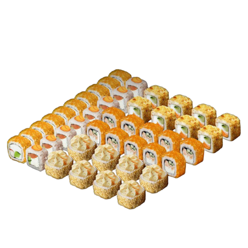 Лосось жареный, сыр, огурец, курица на гриле,чипсы, помидорка, сырный соус, масага, краб (имитация), пекинская капуста.
